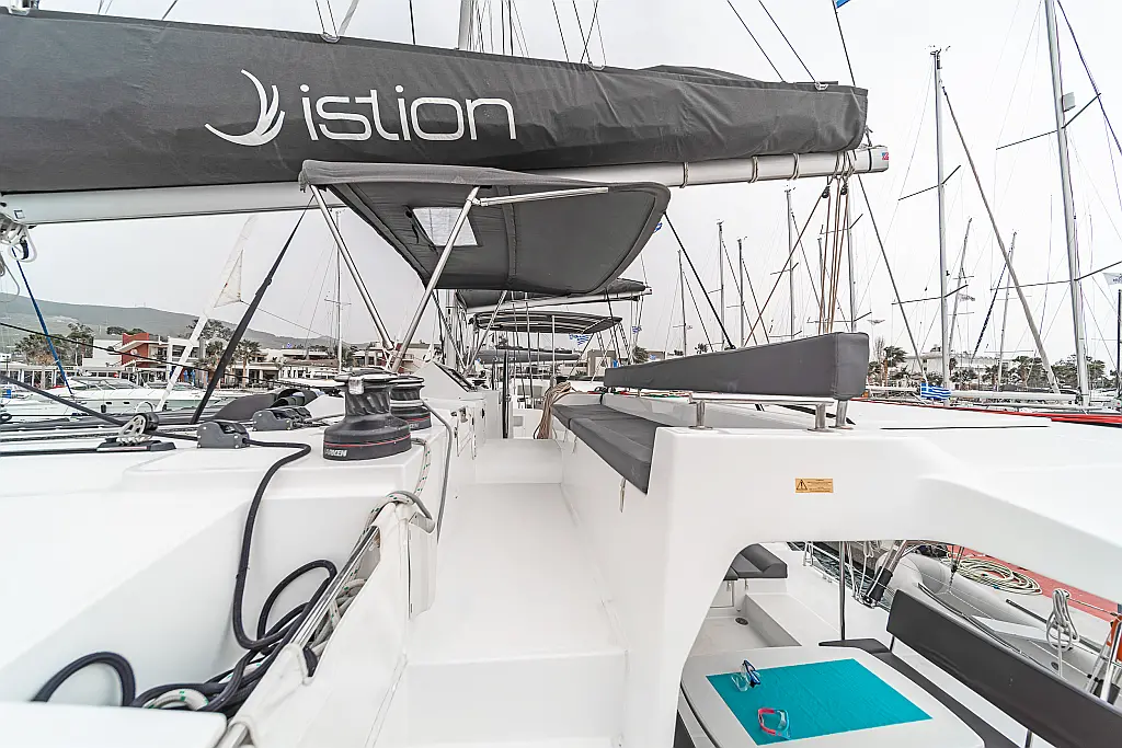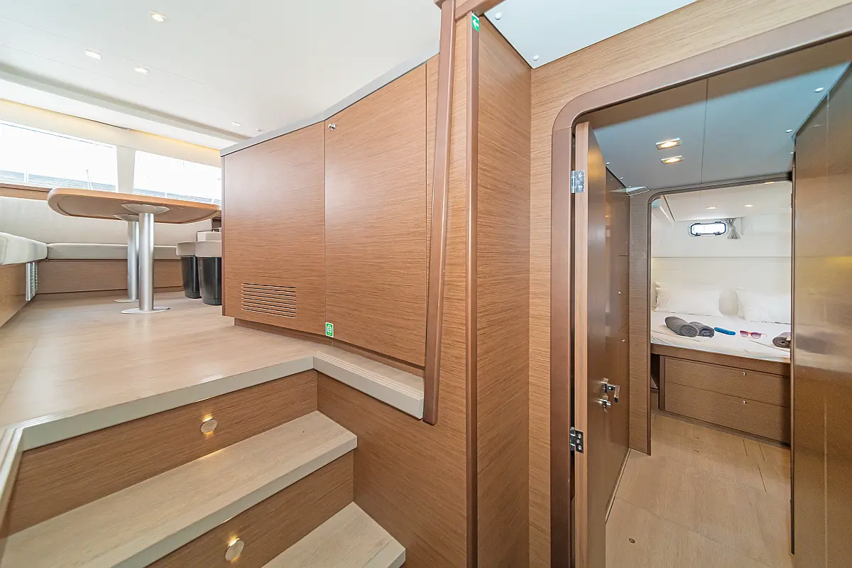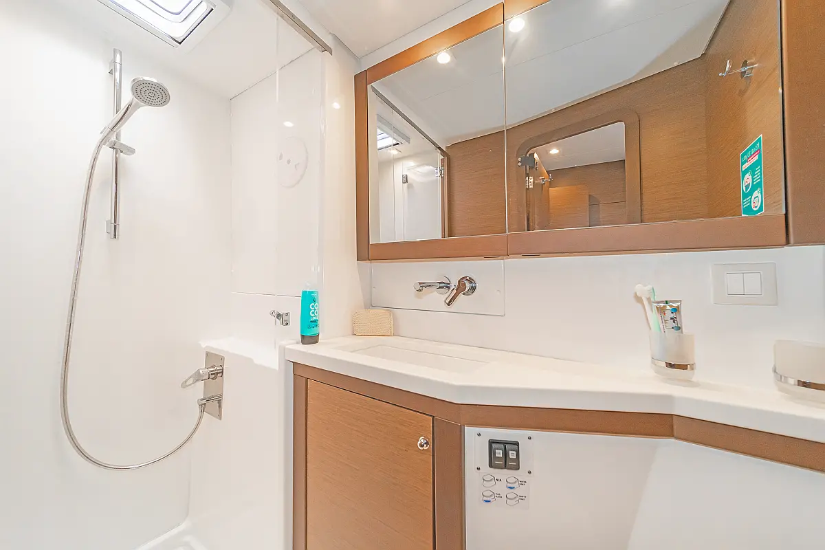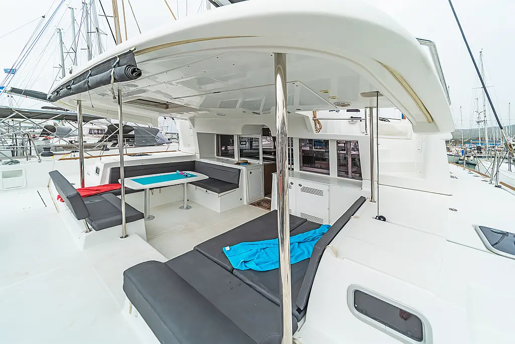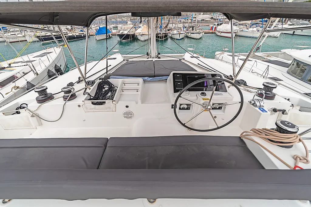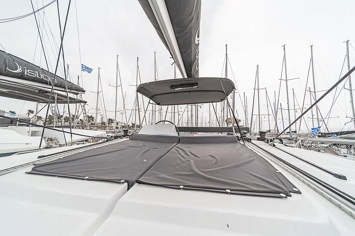 Cockpit-Kissen, Sprayhood, Bimini, Generator, Wassermacher, Elektrische Toilette, Kühlschrank, Hydraulische Gangway, Solar-Panele, Lautsprecher im Cockpit