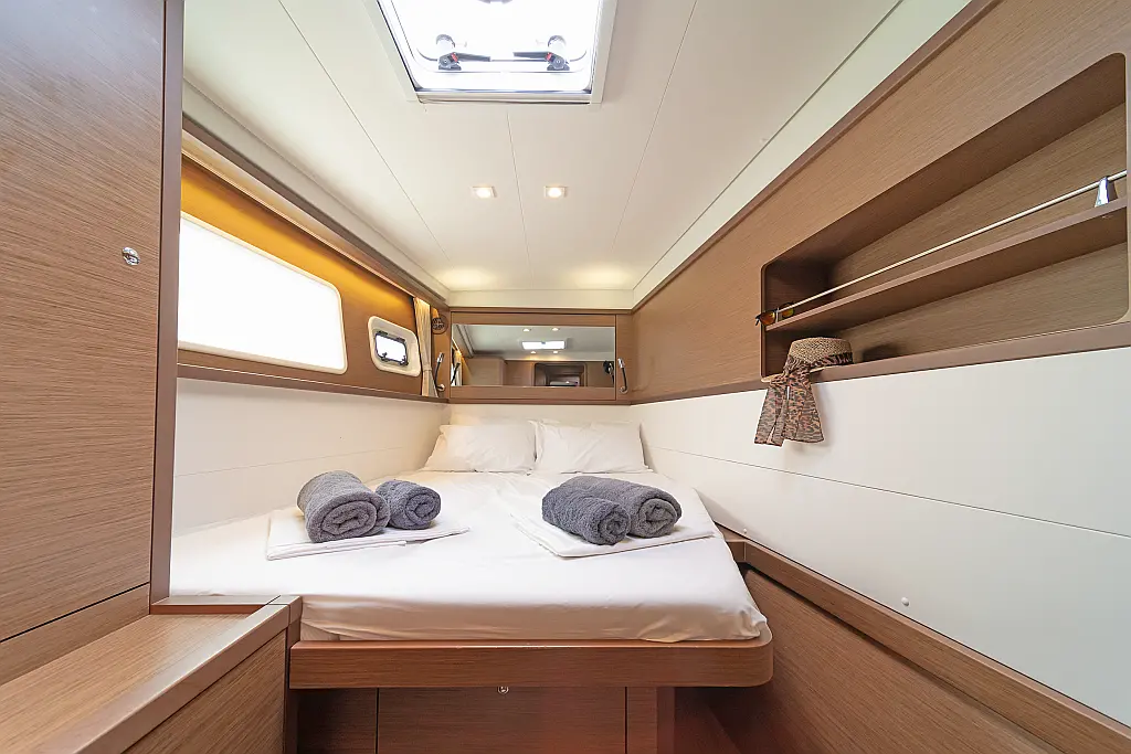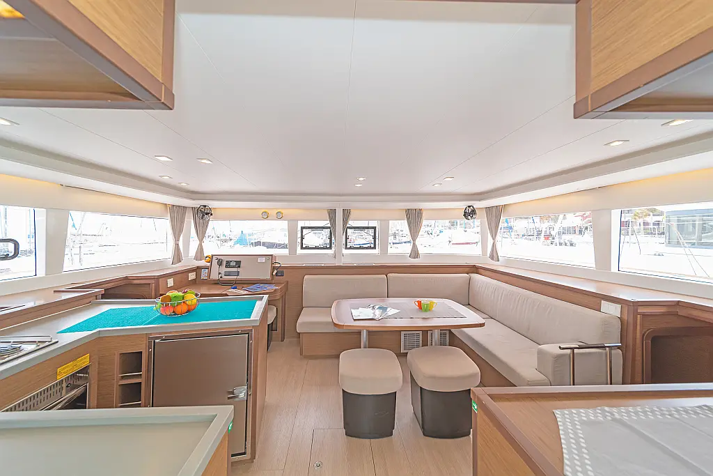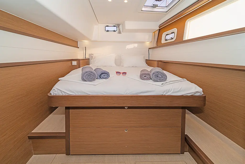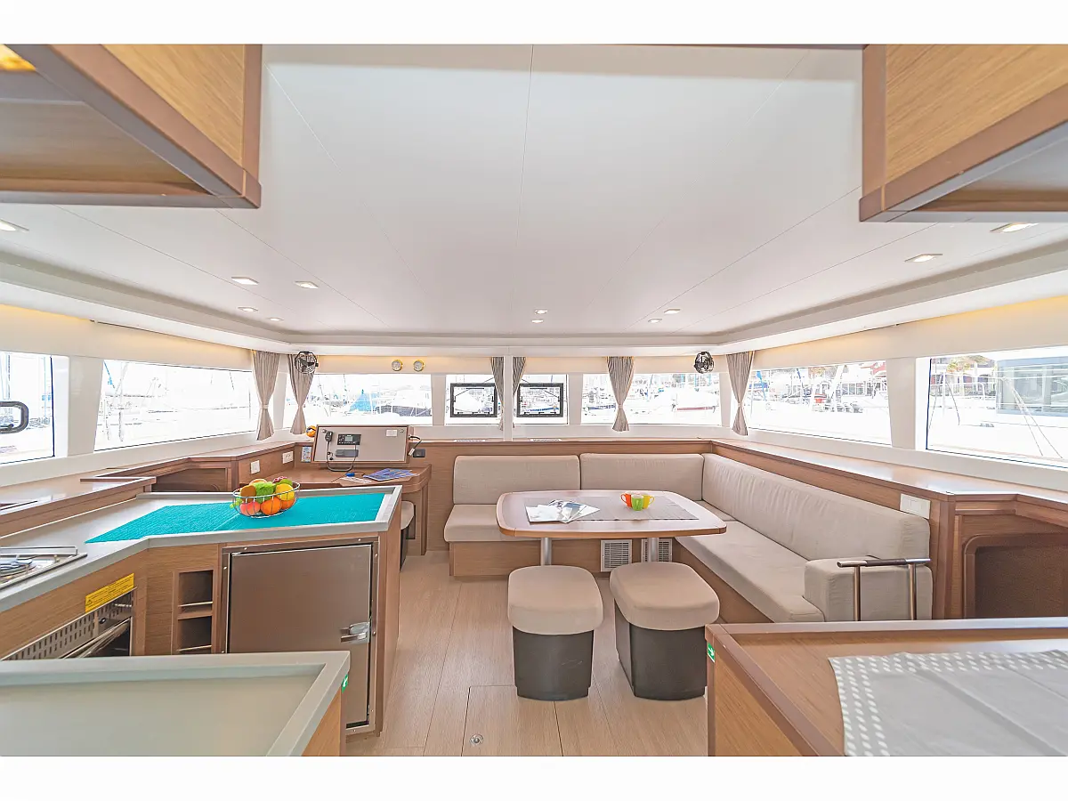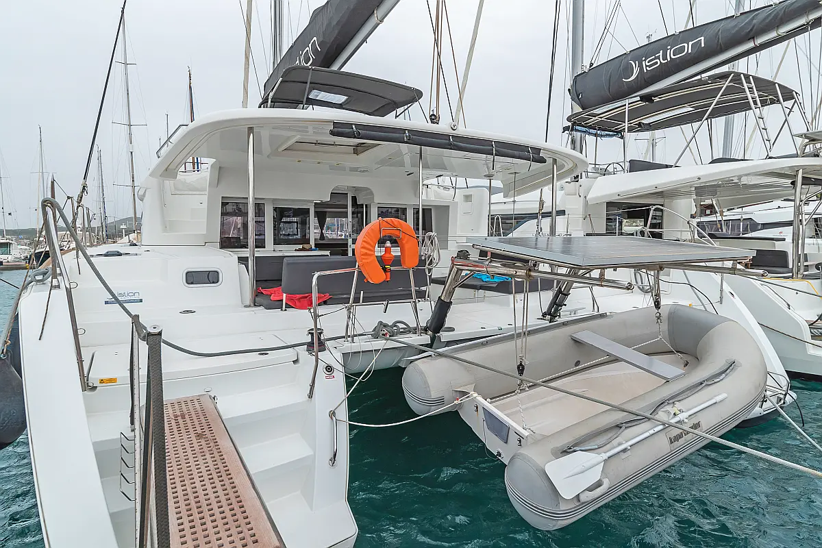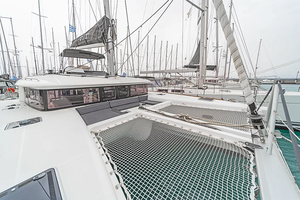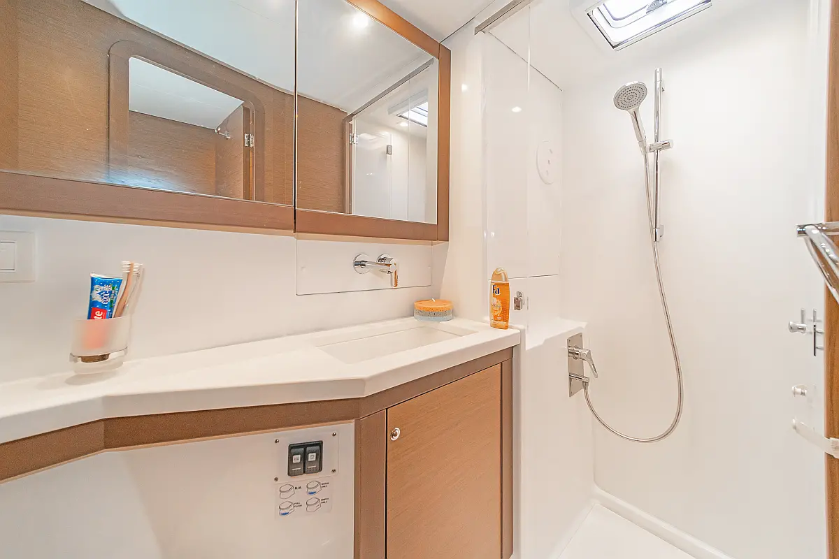 Cockpit-Kissen, Sprayhood, Bimini, Generator, Wassermacher, Elektrische Toilette, Kühlschrank, Hydraulische Gangway, Solar-Panele, Lautsprecher im Cockpit