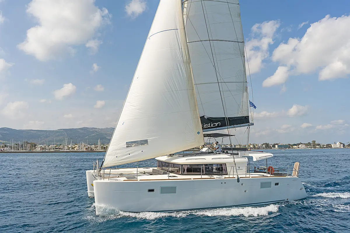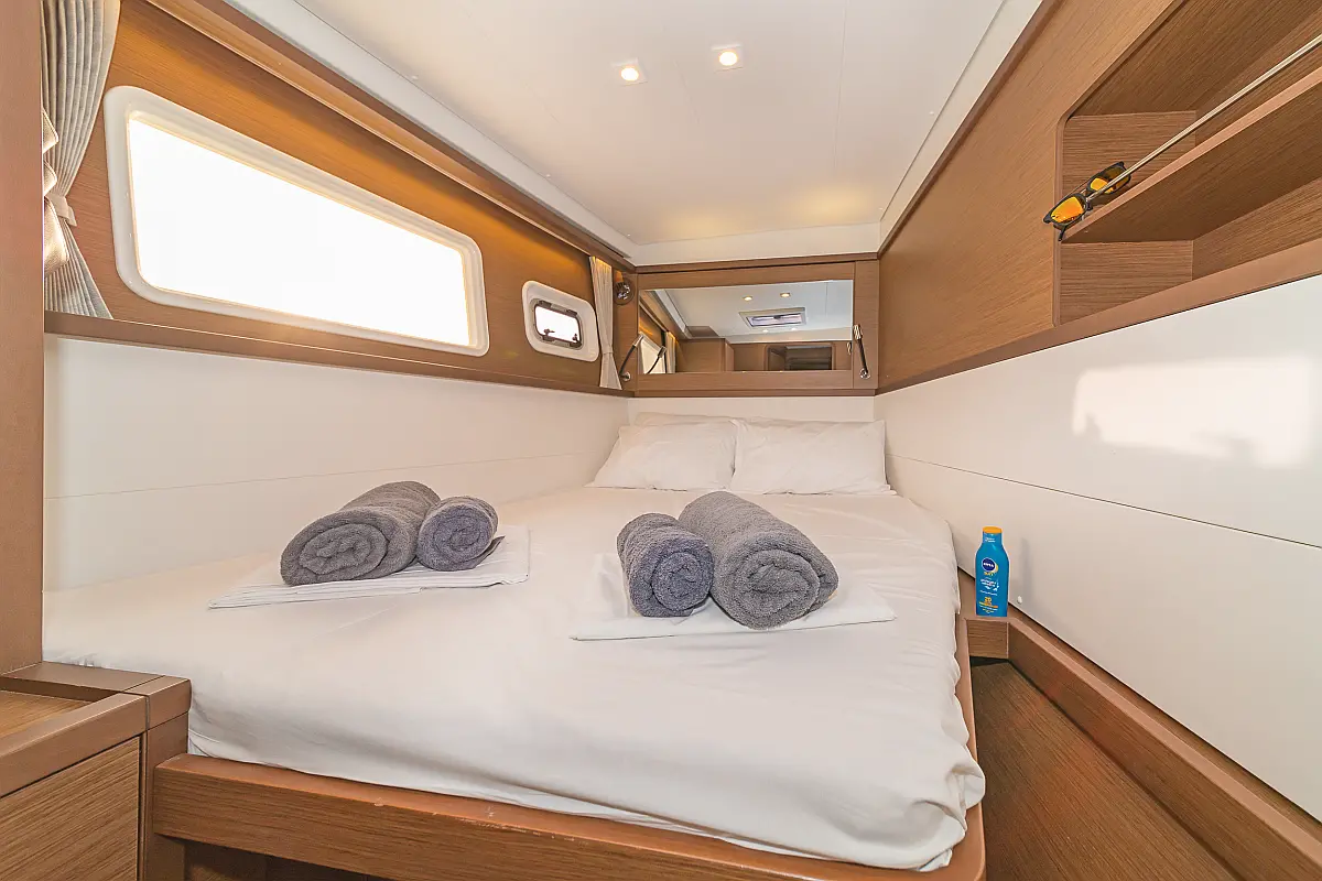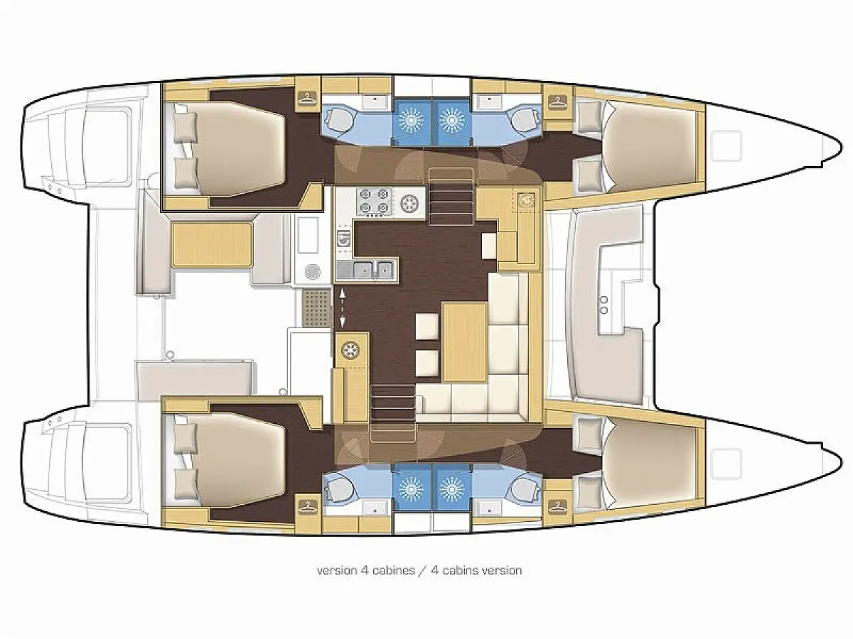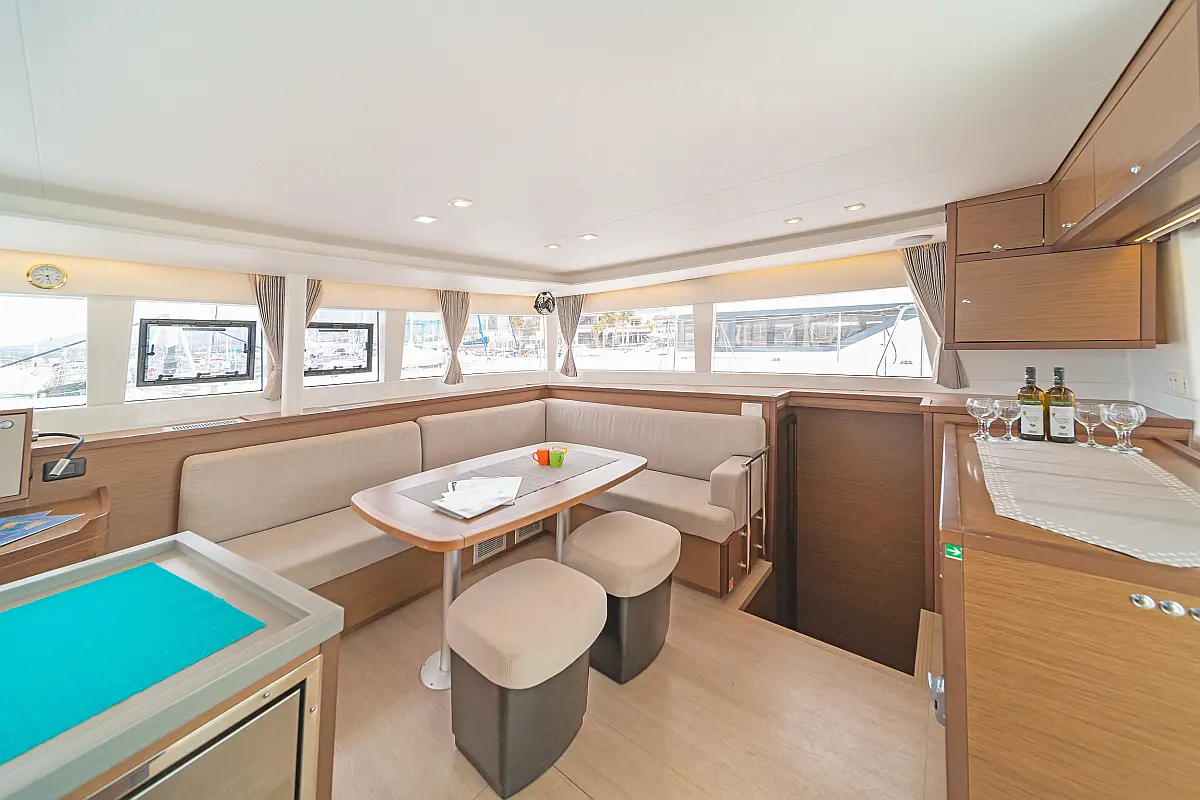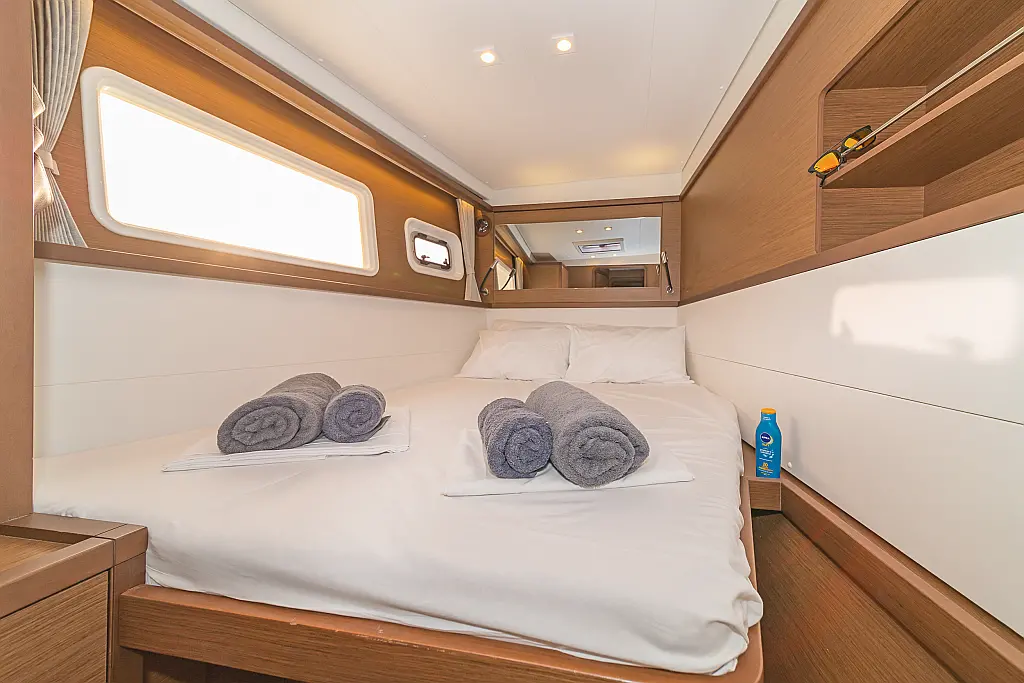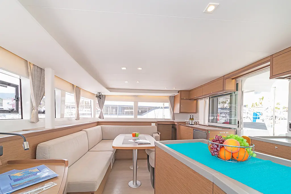Cockpit-Kissen, Sprayhood, Bimini, Generator, Wassermacher, Elektrische Toilette, Kühlschrank, Hydraulische Gangway, Solar-Panele, Lautsprecher im Cockpit