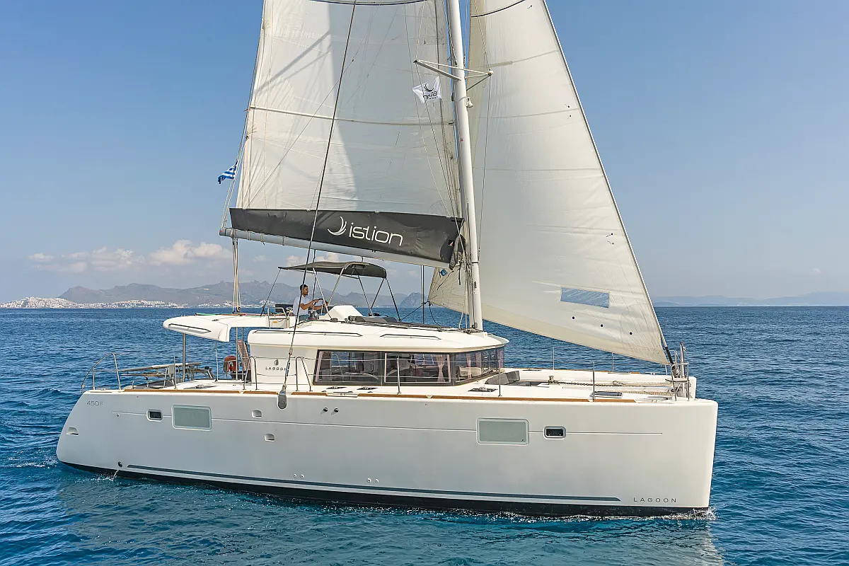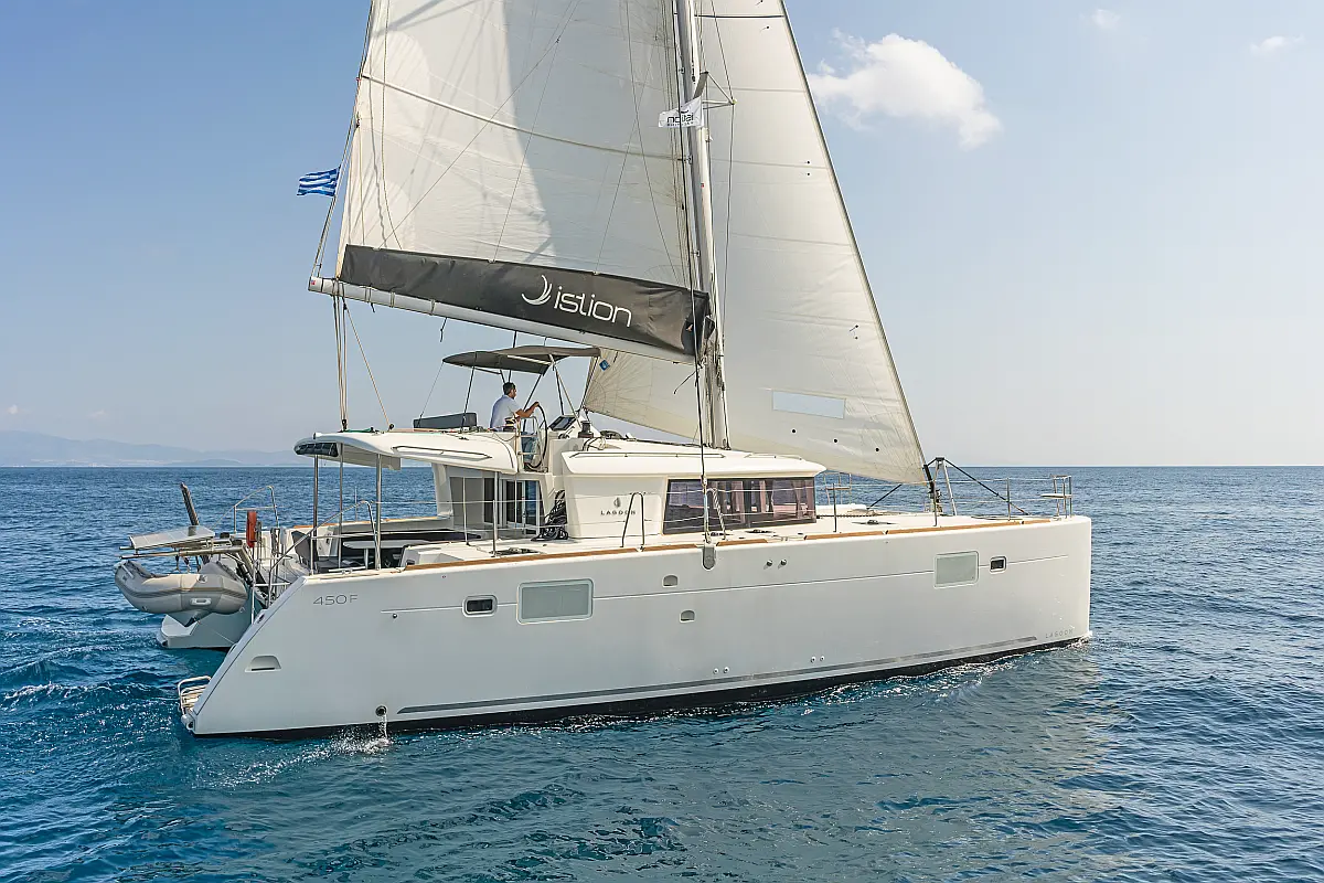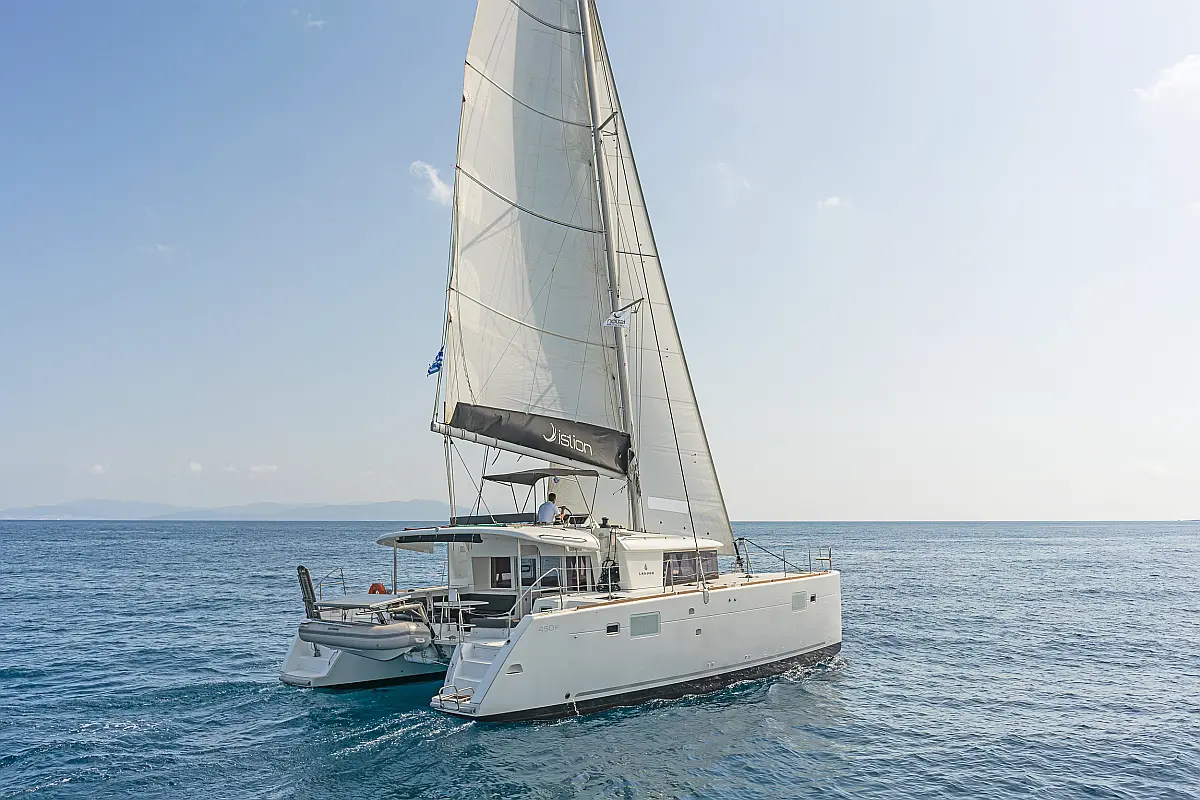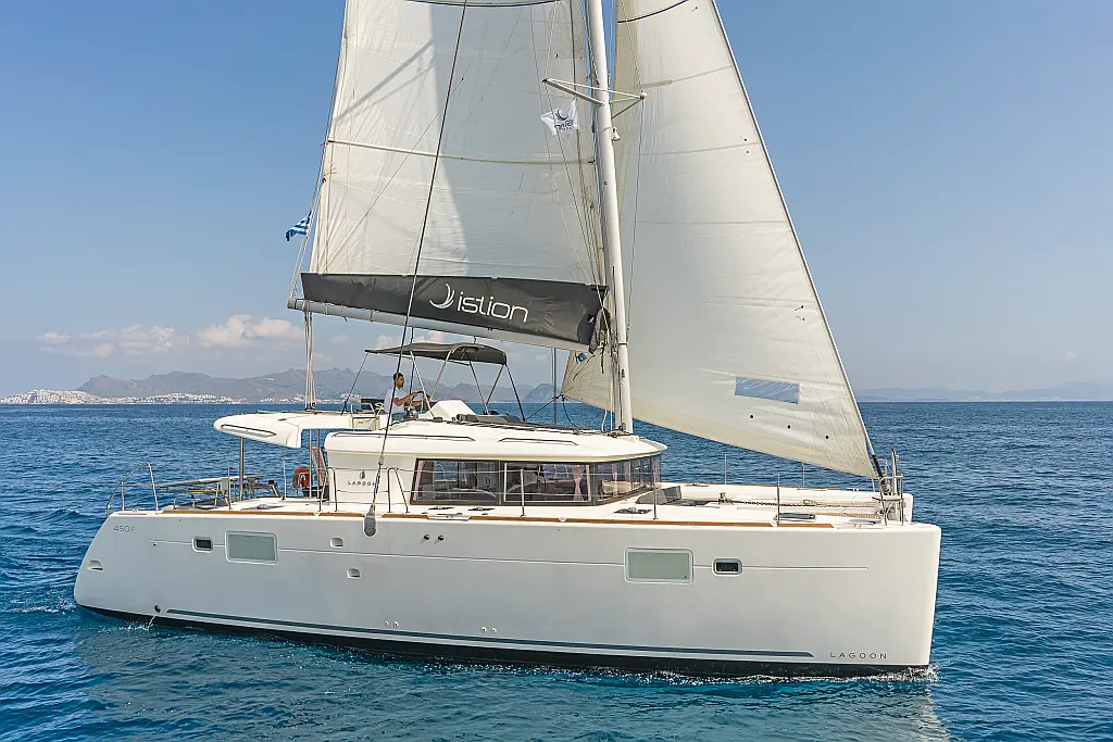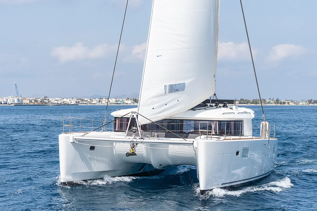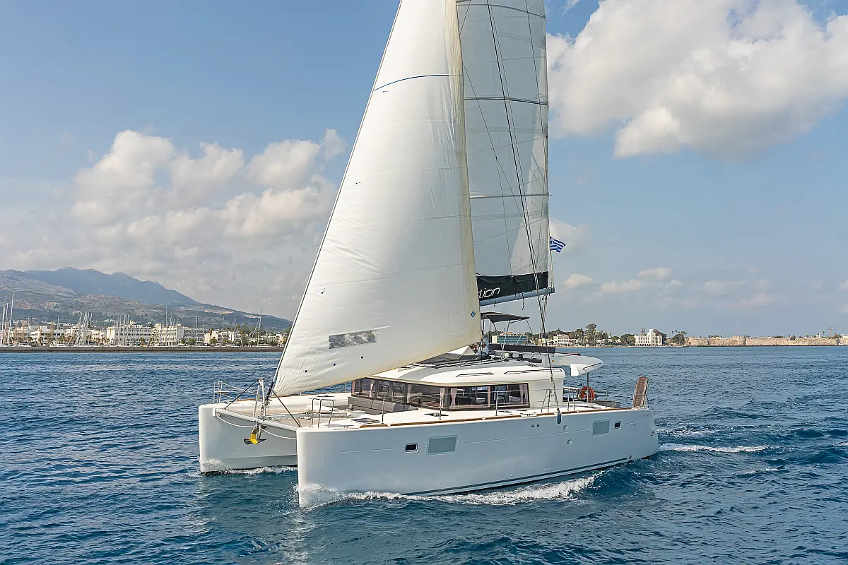 Cockpit-Kissen, Sprayhood, Bimini, Generator, Wassermacher, Elektrische Toilette, Kühlschrank, Hydraulische Gangway, Solar-Panele, Lautsprecher im Cockpit