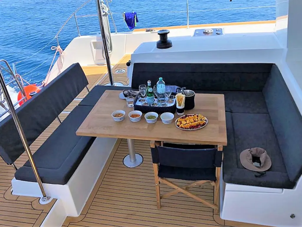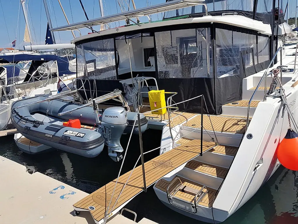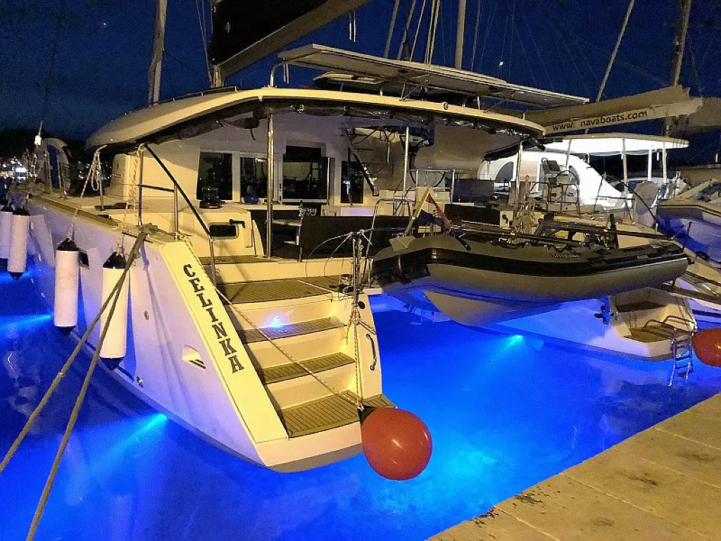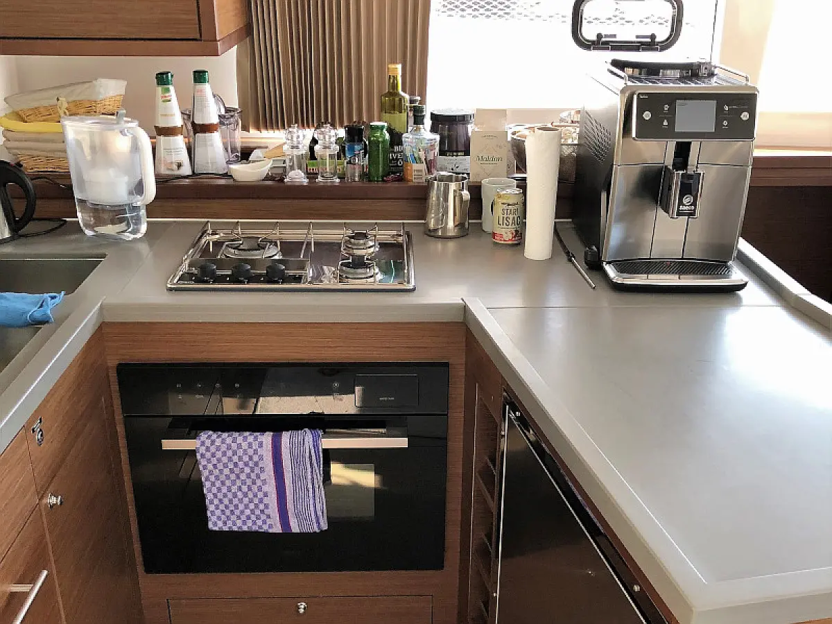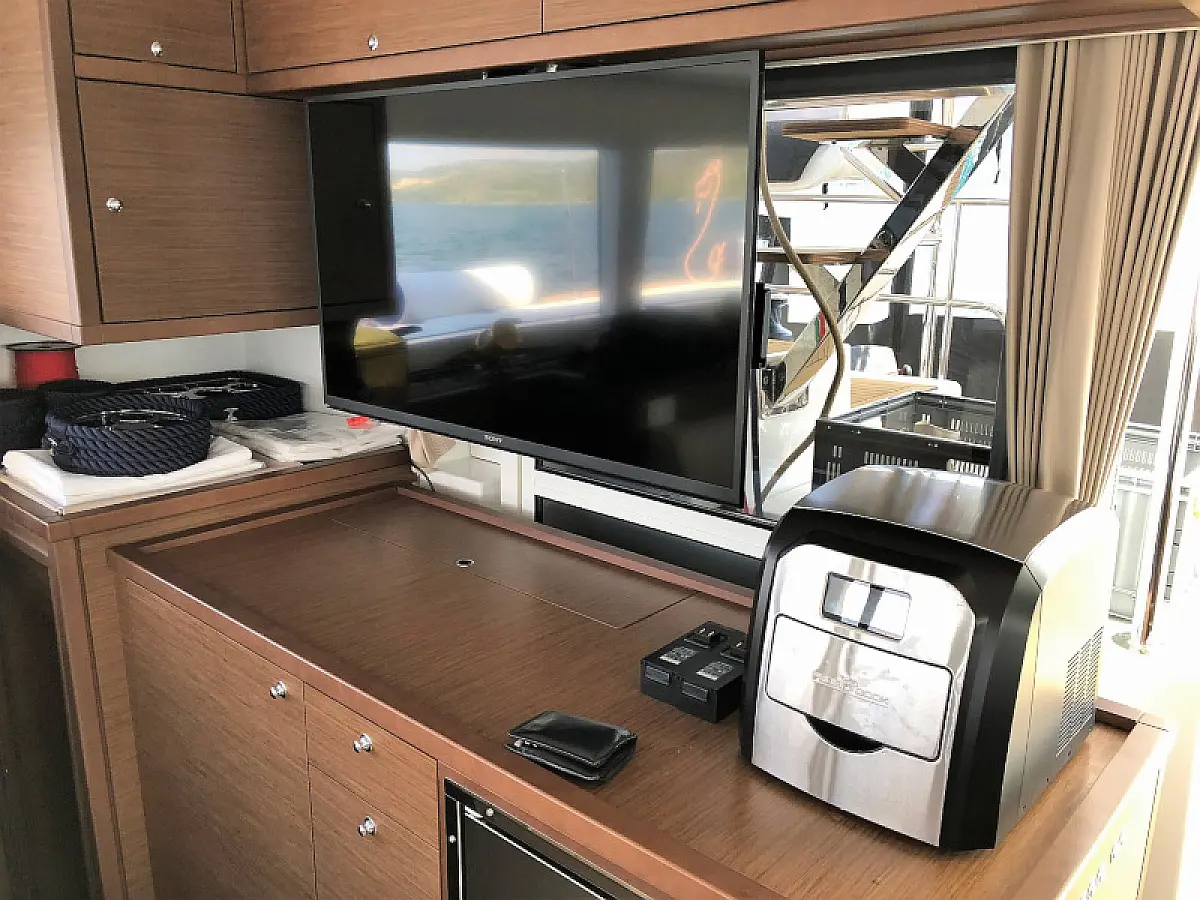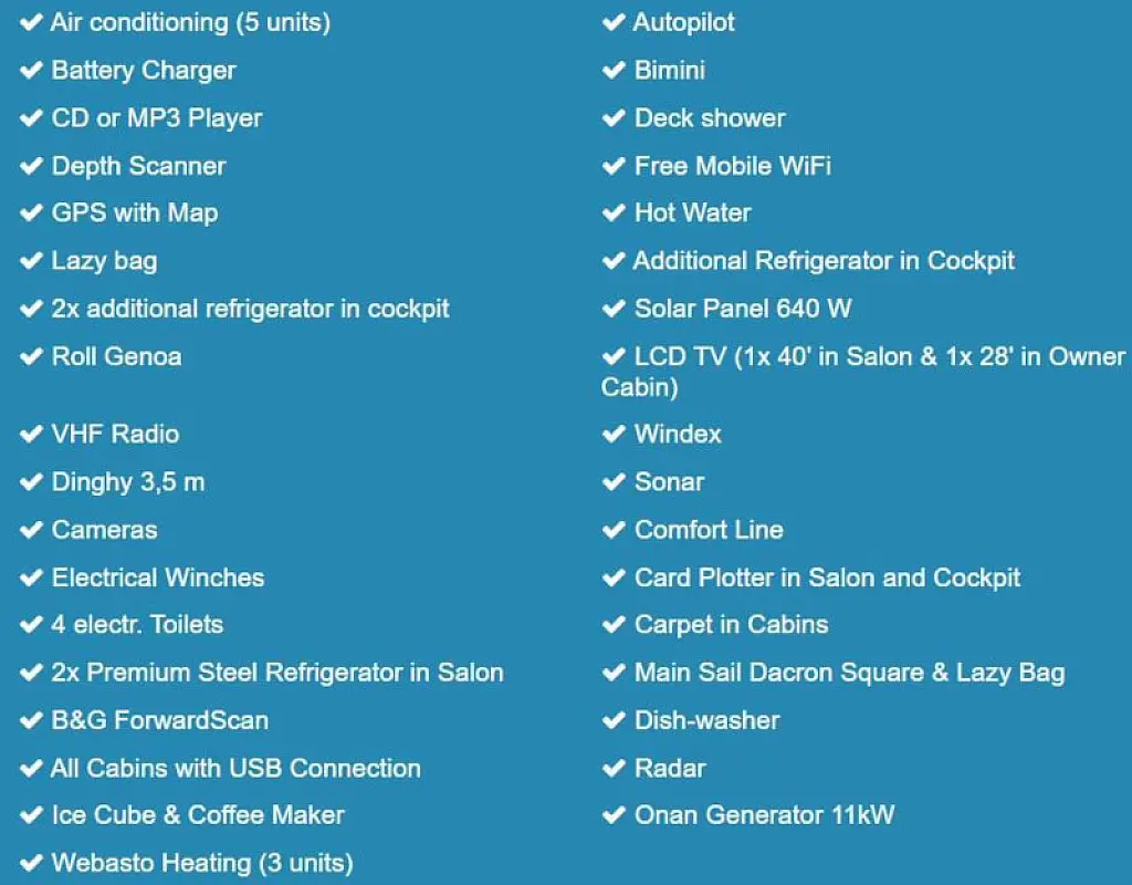 Kühlschrank, Klimaanlage, Elektrische Winch (Segel), Bimini, Beiboot, Geschirrspüler, Elektrische Toilette, Generator, Inverter, Kaffeemaschine, Solar-Panele