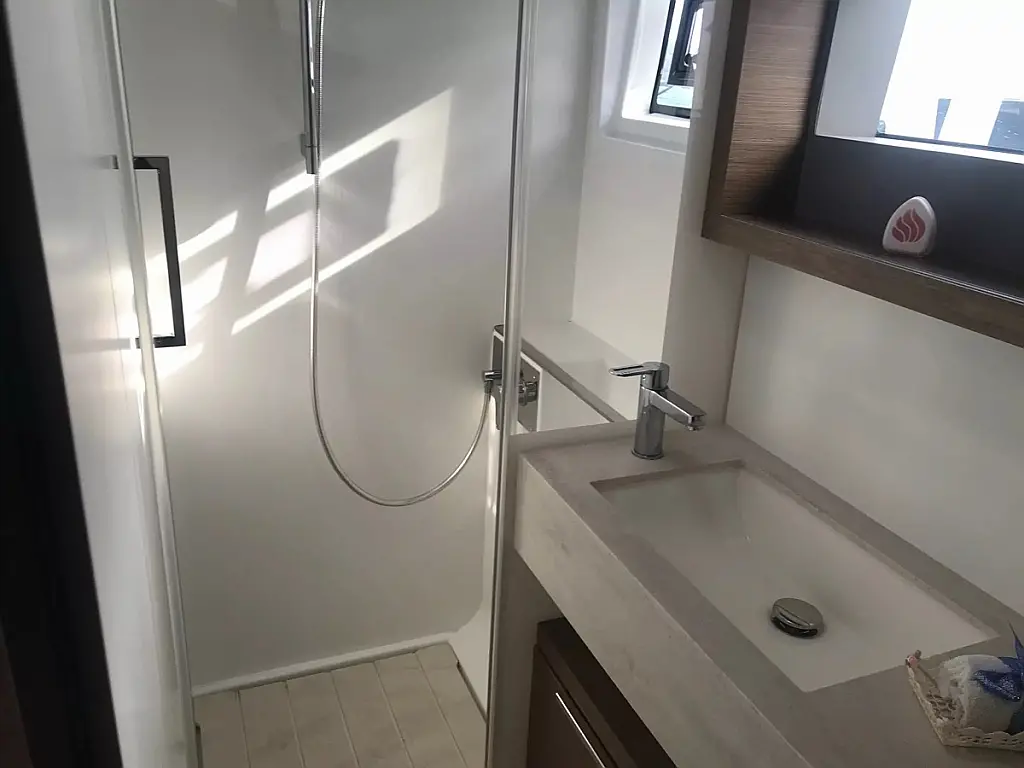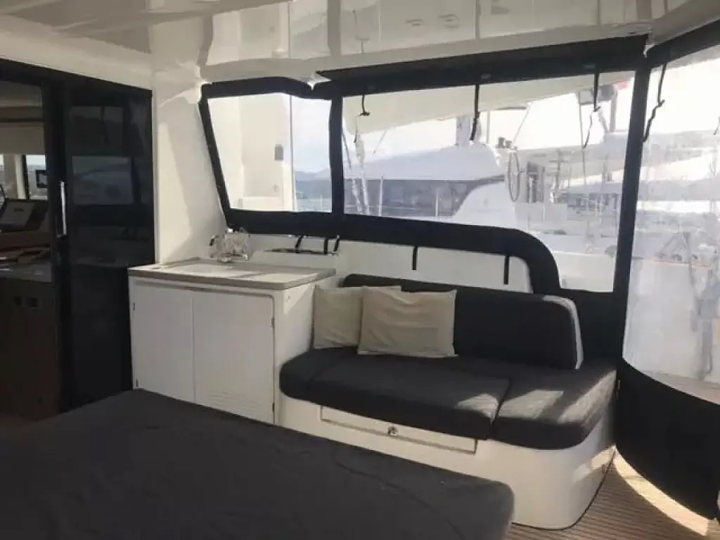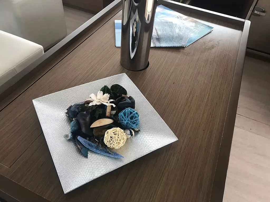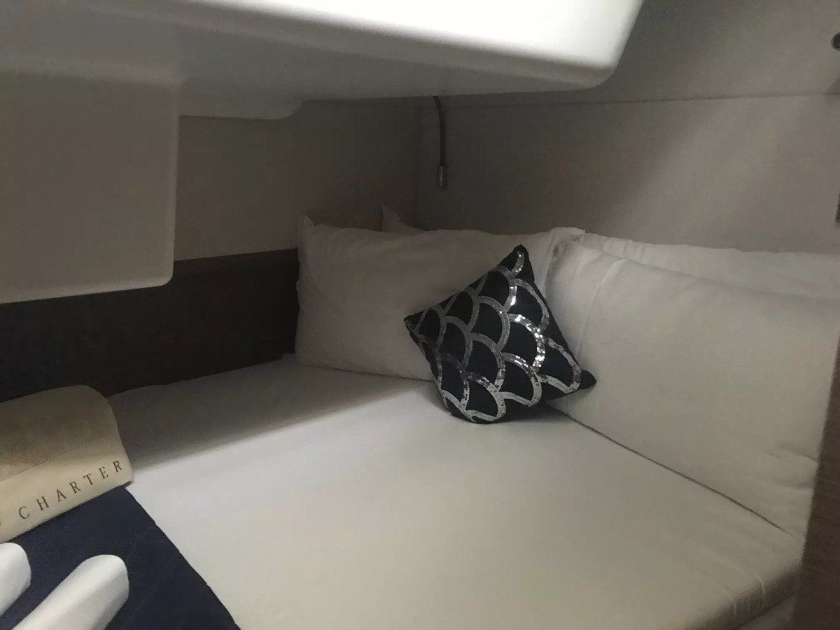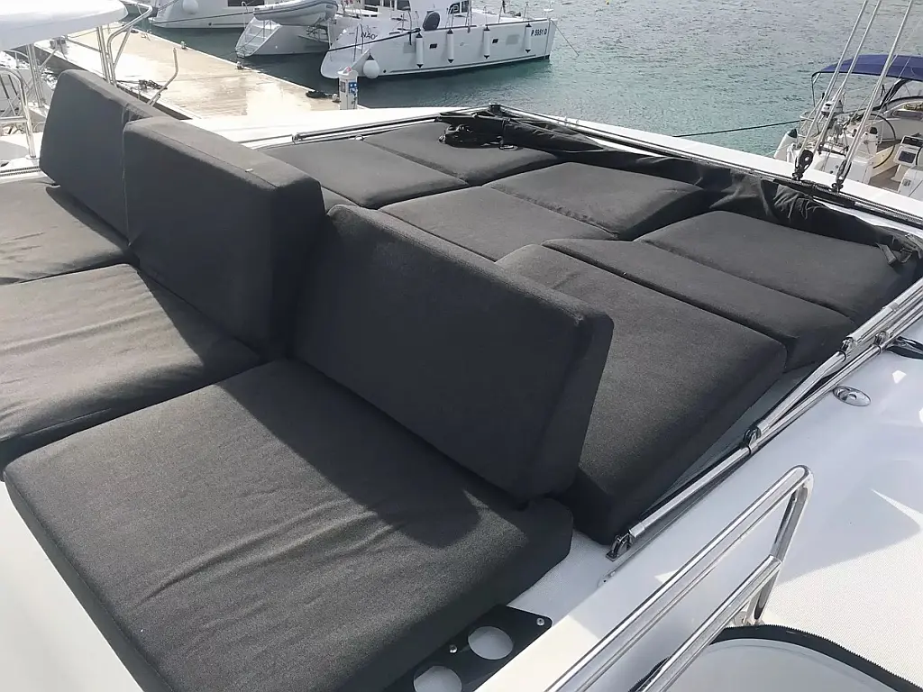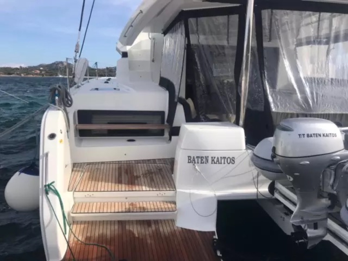 Cockpit-Kissen, Lautsprecher im Cockpit, Kaffeemaschine, Inverter, Außenbordmotor, Generator, Teak Cockpit, Beiboot, Kühlschrank, Bimini, Elektrische Toilette, Klimaanlage, Wassermacher, Hydraulische Gangway, Sprayhood