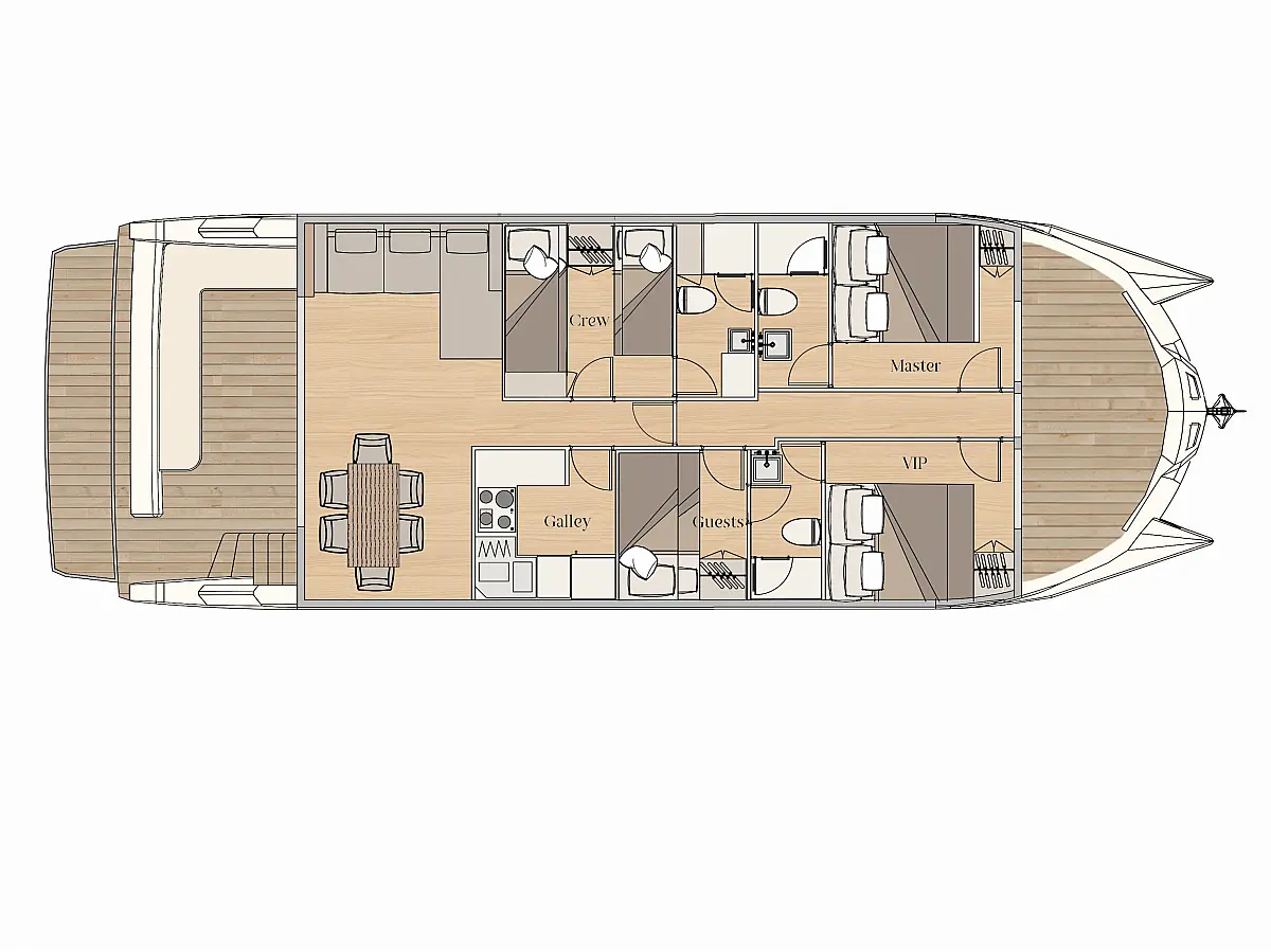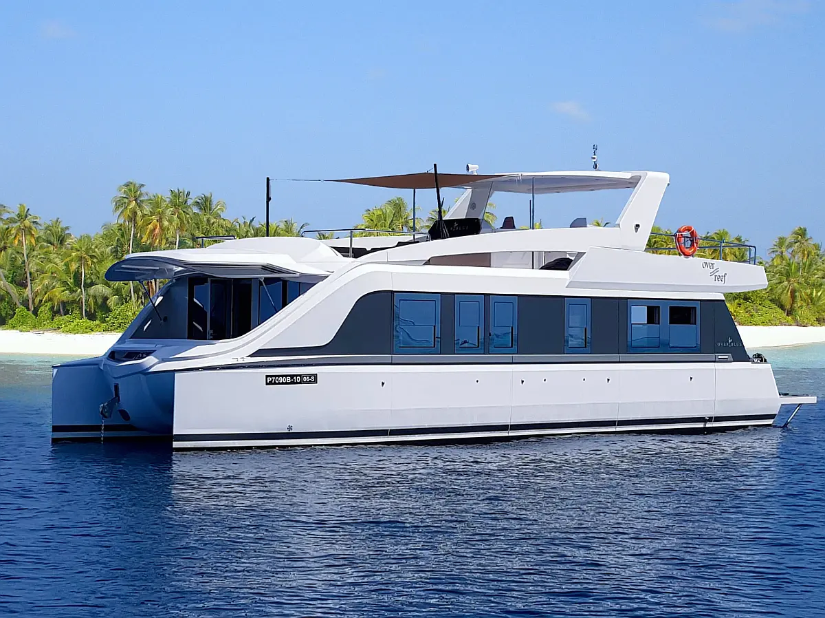 Bimini, Generator, Inverter, Grill im Cockpit, Wi-Fi und Internet, Klimaanlage, Cockpit-Kissen, Lautsprecher im Cockpit, Kaffeemaschine, Hydraulische Gangway, Beiboot, Solar-Panele, Wassermacher, Badeplattform
